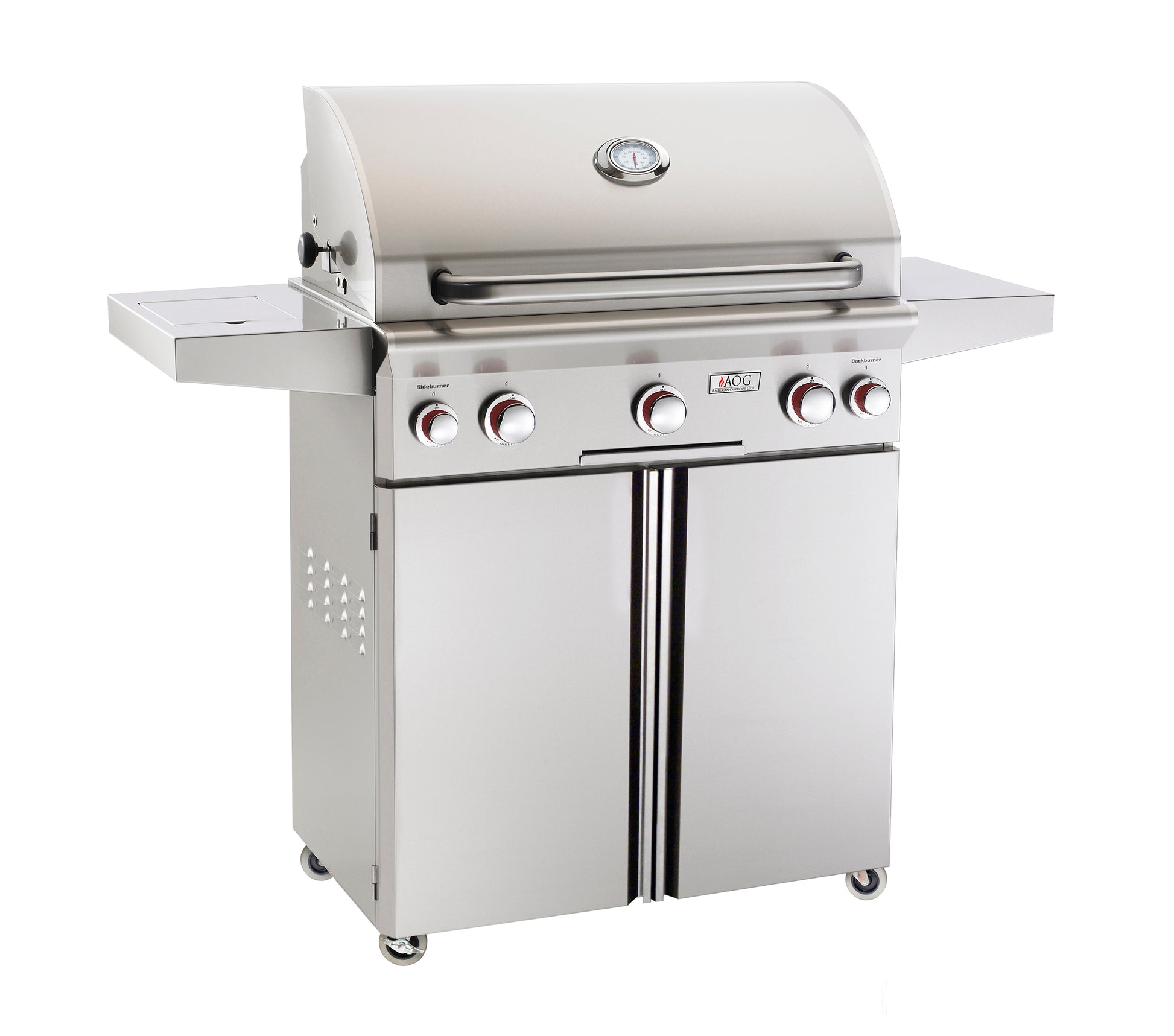 The American Outdoor Grill portable collection is designed for long-lasting, unsurpassed performance that produces unbelievable flavor. Proudly made in the USA and built to last, this AOG T-Series propane gas grill features commercial grade 304 series stainless steel construction, long-lasting stainless cooking grids and heavy-duty warming rack, and highly-sophisticated stainless steel 45,000 BTU U-shaped burners with integrated support posts for performance and durability. If you enjoy grilling veggies, steaks, and chicken all year long on an incredible grill, the first thing you will appreciate is the brand-new Piezo Rapid Light ignition, firing you up that much quicker with no electricity or batteries. Other great features on this grill include 540 sq inches of primary grilling space, stainless steel vaporizer panels (also called flame tamers) for even heat distribution, solid brass valves with red-flared front knobs for precise temperature control and longer life, and a funnelled grease management system with slide-out drip tray for painless clean up. Roast a better bird with the high performance rotisserie kit with 10,000 BTU infrared back burner. All AOG portable grills ship fully-assembled (except side shelves) on large, durable 2 1/2 inch wheels. Alongside the rest of the AOG line, they boast a stylish, sleek appearance, including the beautiful double-layered satin finish hood, stainless steel construction, and custom-designed analog thermometer with polished bezel. Whether you enjoy entertaining the neighbors or rounding up the family for a fresh meal, this AOG 30-inch T-Series gas grill will add style and cooking excellence to compliment your outdoor lifestyle.