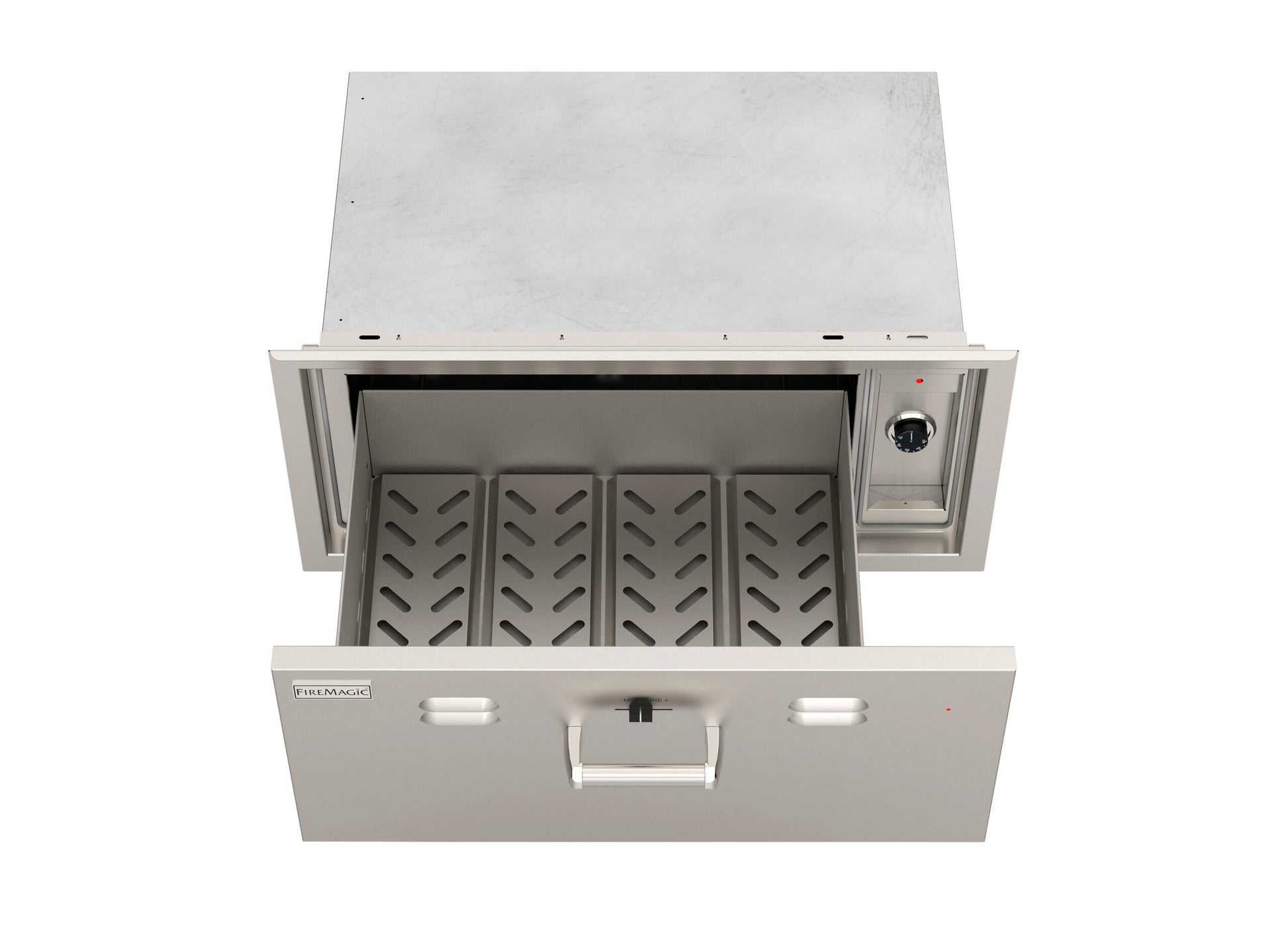 Complete your Fire Magic outdoor kitchen with their complete line of stainless doors and drawers. This Fire Magic 30-inch warming drawer is fully sealed, has a temperature control knob to keep your foods warm and a stainless steel frame and face for years of outdoor use and dependability. It has a maximum temperature setting of 230 degrees to keep your food at just the right temperature. It is designed to match perfectly with other Choice and Legacy series products and requires a 110V connection.